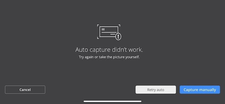 When Chase’s mobile banking app’s “auto capture” feature isn’t able to capture a clear image of the user’s check, the error state offers two ways—”Capture manually” and “Retry auto”—to resolve the issue and move closer to their goal of depositing a check.